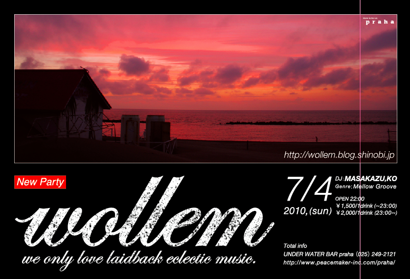 コンセプチュアルでビジュアライズされたNEWパーティ「wollem(ウォルム)。メロウでグルーヴィ、ノスタルジックでアーバン、それがwollem の匂いであり色、音。早過ぎないBPMで時代を行き来しながら進むストーリーは、ゆったりと心地よく、まるで沈む夕日を眺めているよう。メロディに心を奪 われ、いつかの記憶を辿るように目を閉じてしまったらウォルムトラップのはじまり。沈んだはずの夕日はいつの間にか頭上で強い日差しとなり、肌をジリジリ と照りつける。体温と感情は静かに熱を帯びていき、日射病のようにクラクラとめまいがする。wollemは体感してこそ温度が分かり、匂いが染み付くも の。静かに温もる感情と体温を体験せよ!(MASAKAZU & KO)