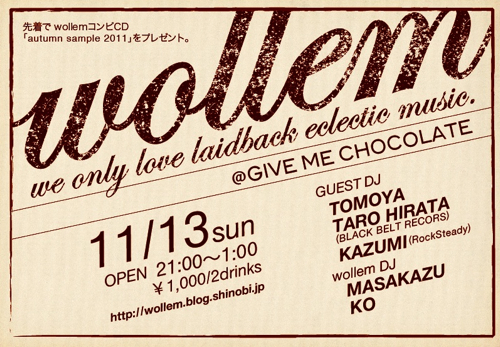 ※当日は、wollemの新作コンピレーションCD「autumn sample 2011」を枚数限定で無料配布。ご希望の方はこっそりマサカズorコウに声をかけてください。